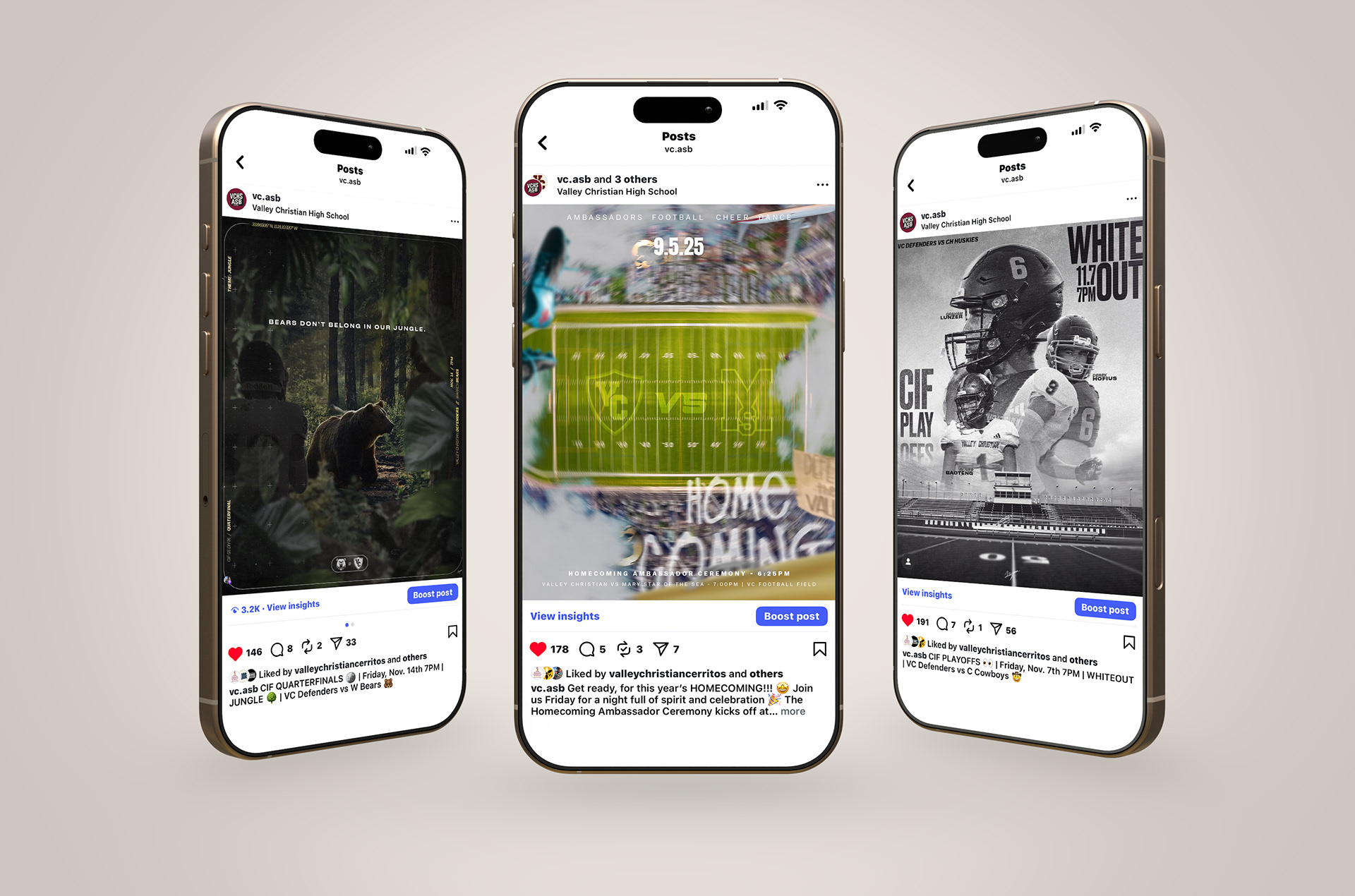 This project focused on creating weekly social media graphics for the Valley Christian High School Varsity Football Friday night games. Each graphic promoted the upcoming game and highlighted the dress code or theme for the night, giving students a clear visual cue for how to show school spirit.