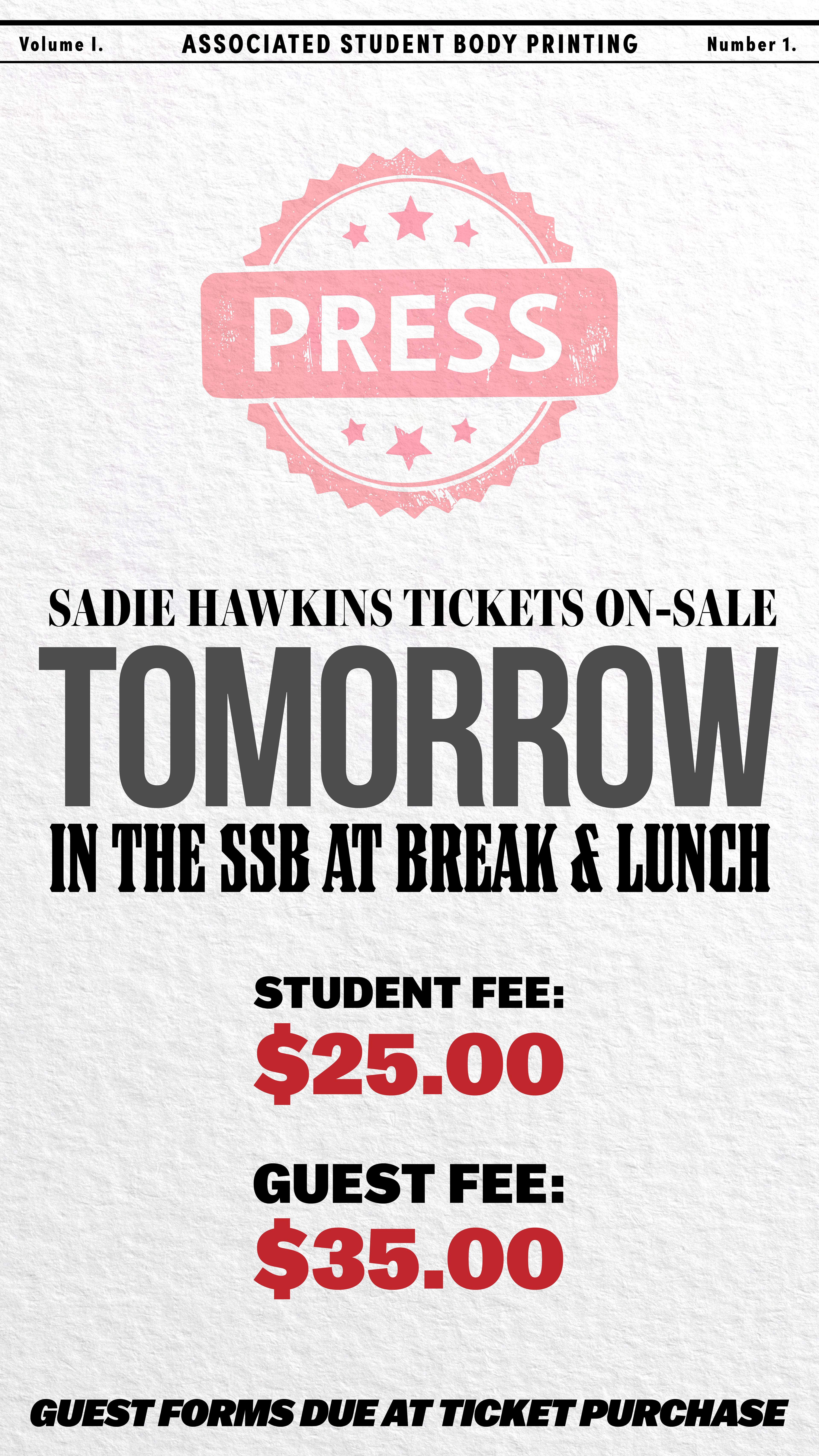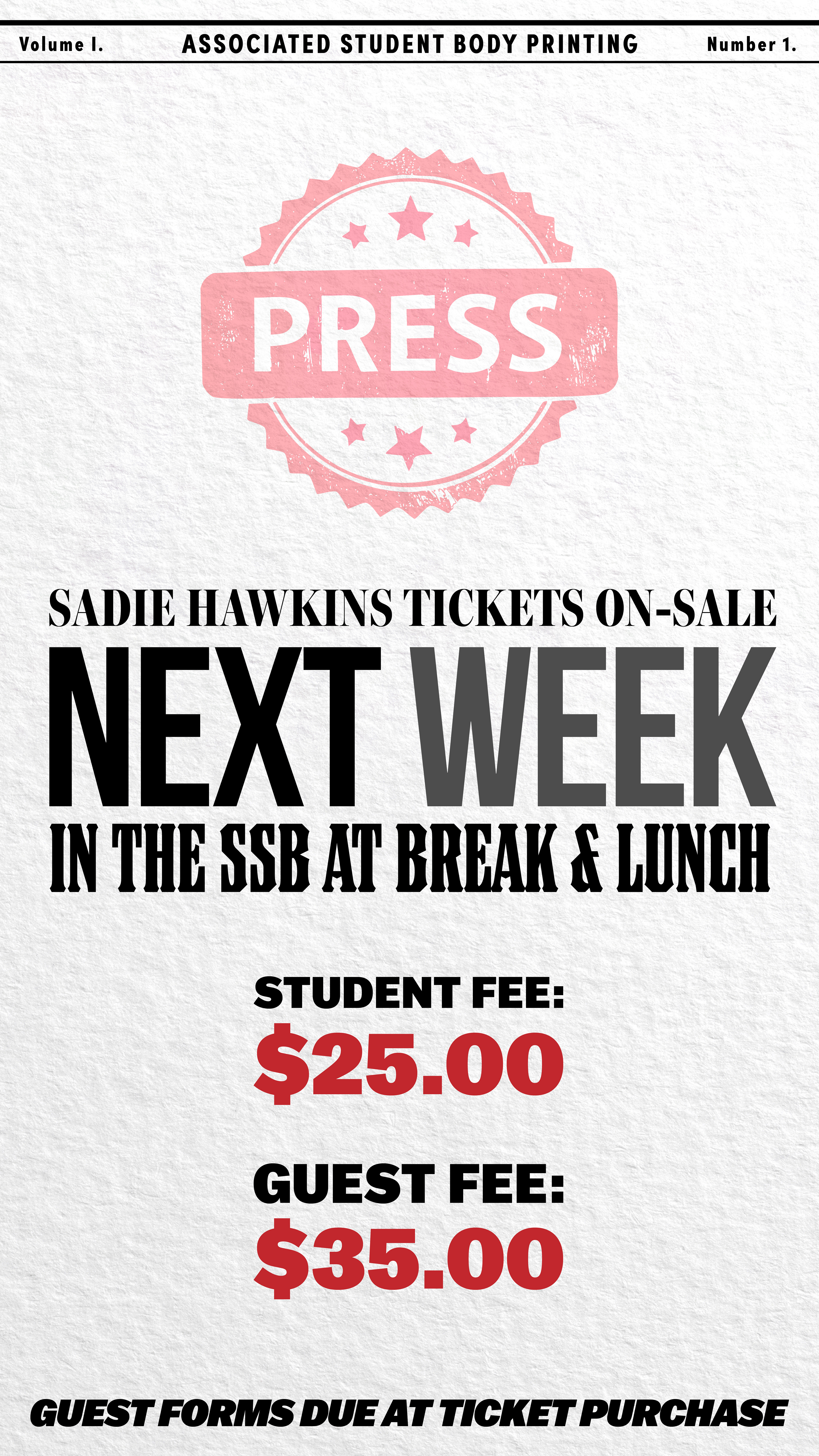 The process for creating the Sadie Hawkins Dance promotional design began with developing a storyline that connected directly to the theme. Members of the Associated Student Body (ASB) were photographed and featured as characters within the narrative, each playing a specific role that contributed to the Western newspaper concept. Their inclusion added personality, humor, and authenticity to the overall design.