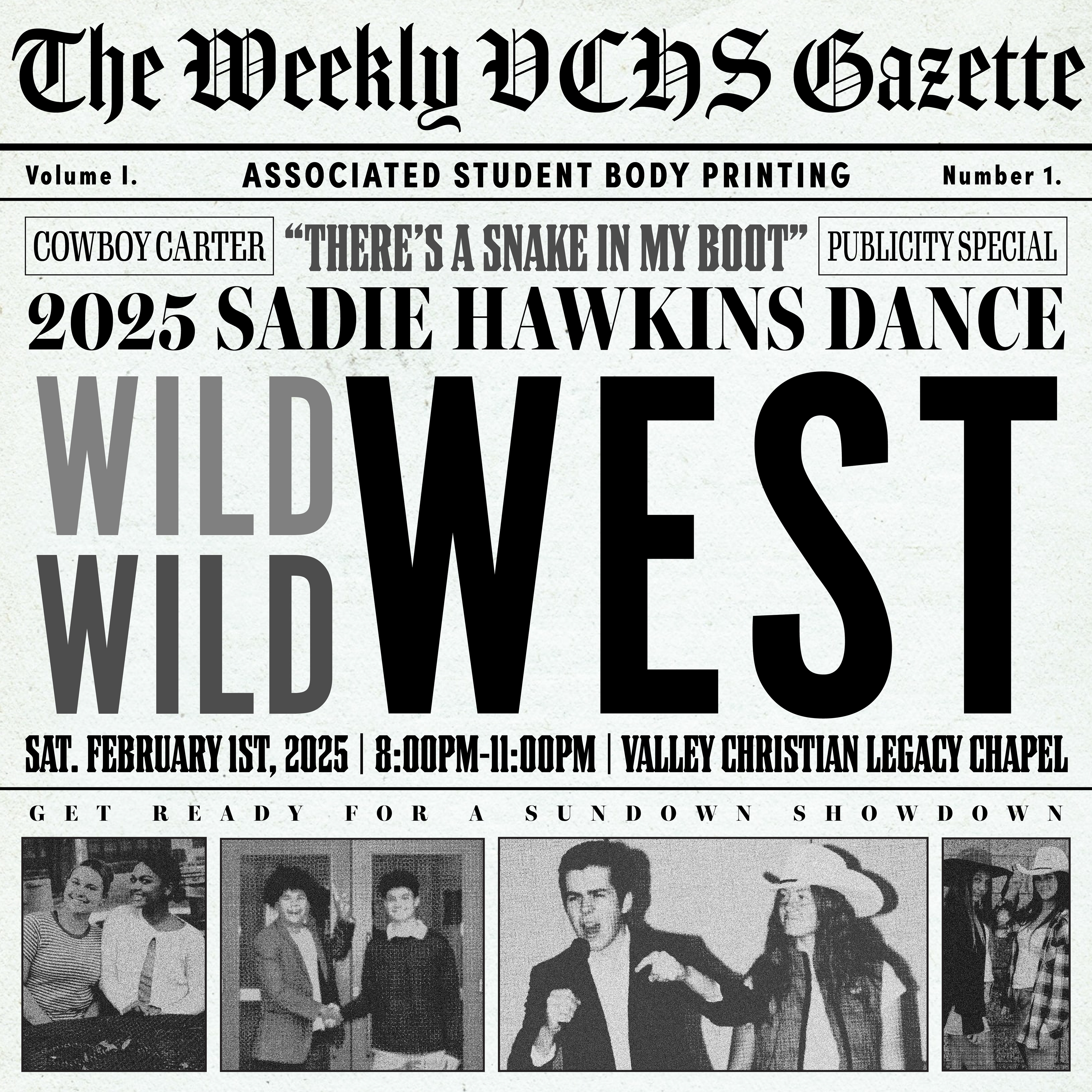 For the Valley Christian High School Sadie Hawkins Dance, the theme was “Wild Wild West.” The goal was to communicate the theme in a creative and engaging way without relying on overly typical Western imagery. To achieve this, I designed the promotional materials in the style of an old Western newspaper, using typography, layout, and texture to evoke the theme subtly and authentically.